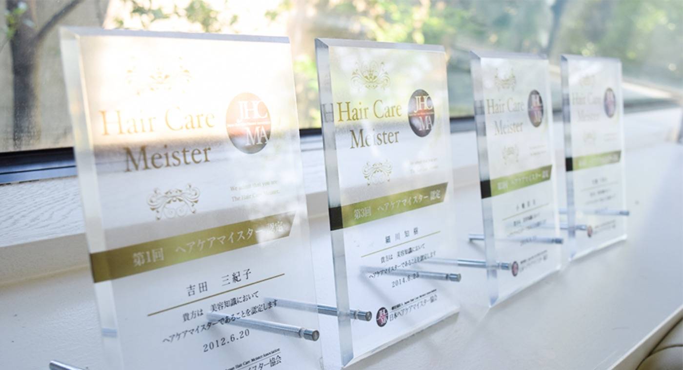 ヘアケアの知識が豊富でお客様の毛髪診断を正しく行うことができ、それに対する処置、アドバイスが的確にできる美容師に与えられる称号です。私たちは、スタッフ全員でヘアケアマイスターに取りくみ、プロとして3つの説明責任を果たしています。