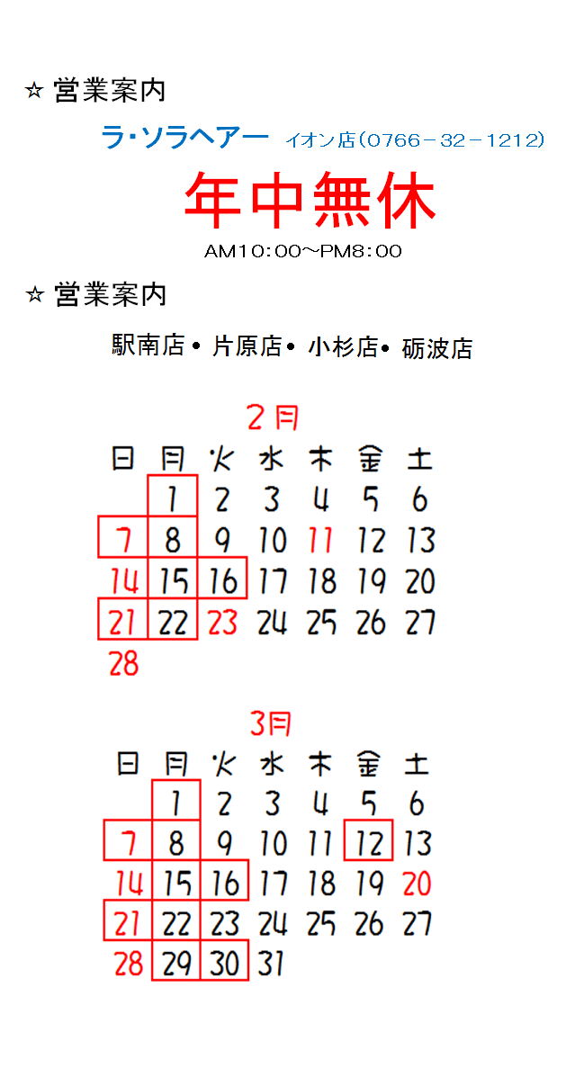 2月3月の営業案内 2021.02.01 ※3/12金曜日は研修のため店休日とさせていただきます。 同日3/12金曜日は高岡イオン店18:00より営業させていただきます。 ご不便おおかけしますが、よろしくお願いします。