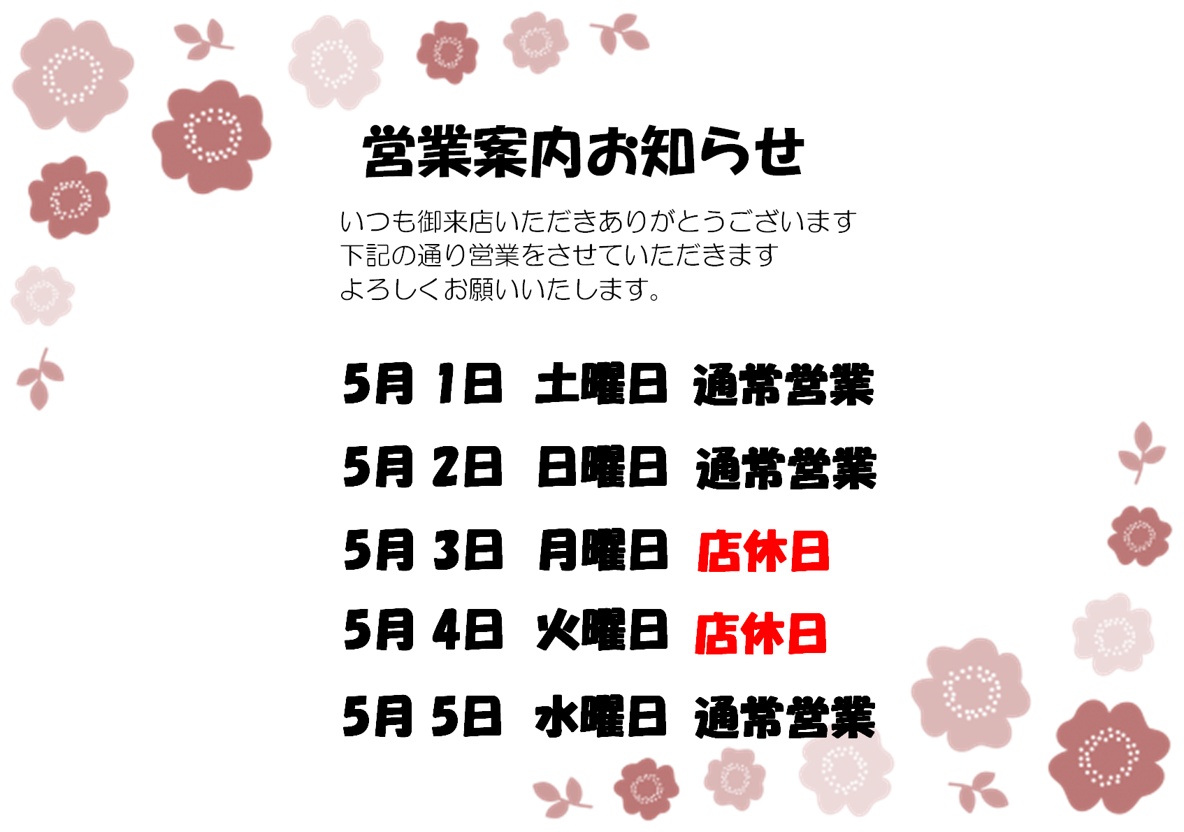 🌈5月臨時営業案内🌈 2021.04.16 複数のお知らせになりますが、通常月と違いますので ご理解よろしくお願いします。 ※ラソラヘアー高岡イオン店は通常通り営業いたします。 皆様のご来店心よりお待ちしております。