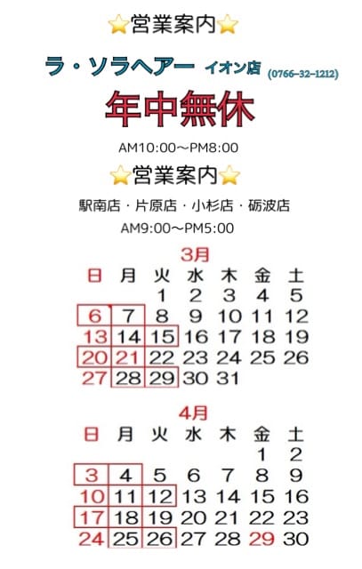 ⭐️3月・4月営業案内⭐️ 2022.02.28 パールヴィ、ラソラヘアーでは感染予防対策を実施しております。 https://pearlv.com/_wp/wp-content/uploads/2020/11/IMG_0158.mp4 🔝 こちらをクリック🤏動画で確認🎞