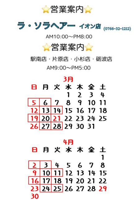 🌷3月4月営業案内🌷