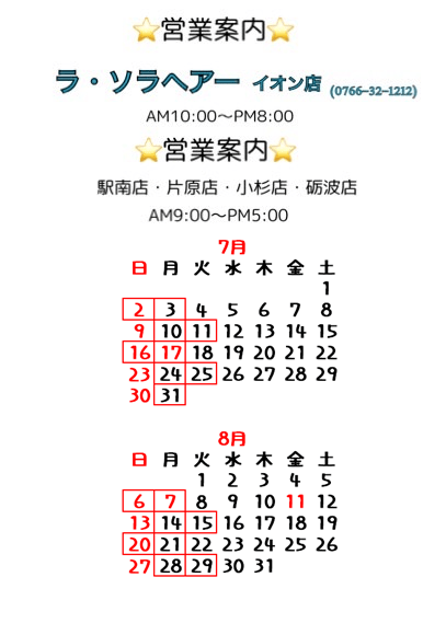🌻7月8月営業案内🌻