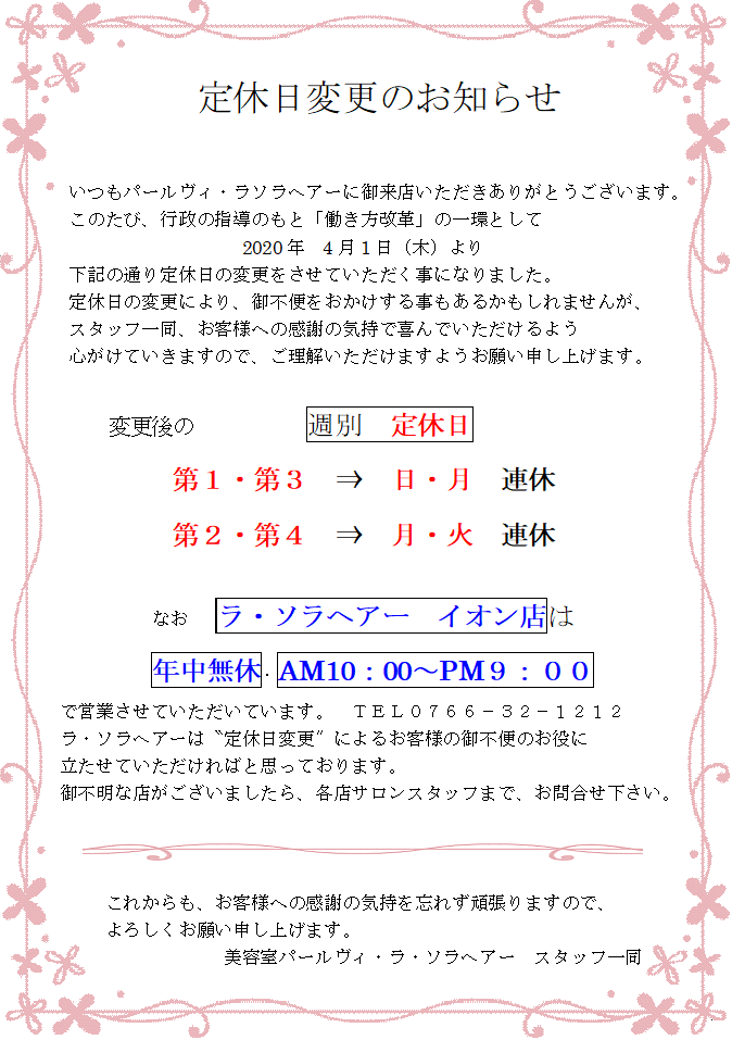 定休日変更のお知らせ