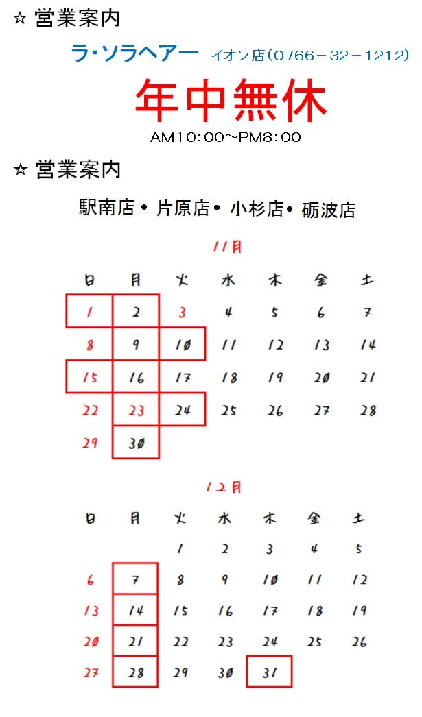 11月12月の営業案内 2020.11.01 パールヴィ駅南店、片原店、小杉店 ラソラヘアー砺波店の12月の店休日は 通常月と異なりますので確認よろしく お願いします! 皆様のご来店心よりお待ちしております! ※感染予防対策をしております